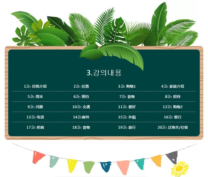 초급 한국어 말하기 1. 교과목 개요 및 강의목적 1-1:围绕标题,进行对话。通过多媒体教学方式,让每位同学身临其境在韩语对话当中。从听说到文化。 1-2:学习1-20课的内容,通过反复练习,可以完全轻松应付在韩国的日常交流。自由行,没问题。 2. 교재 초급 한국어 말하기 3.강의내용 名牌和课本在这里↓