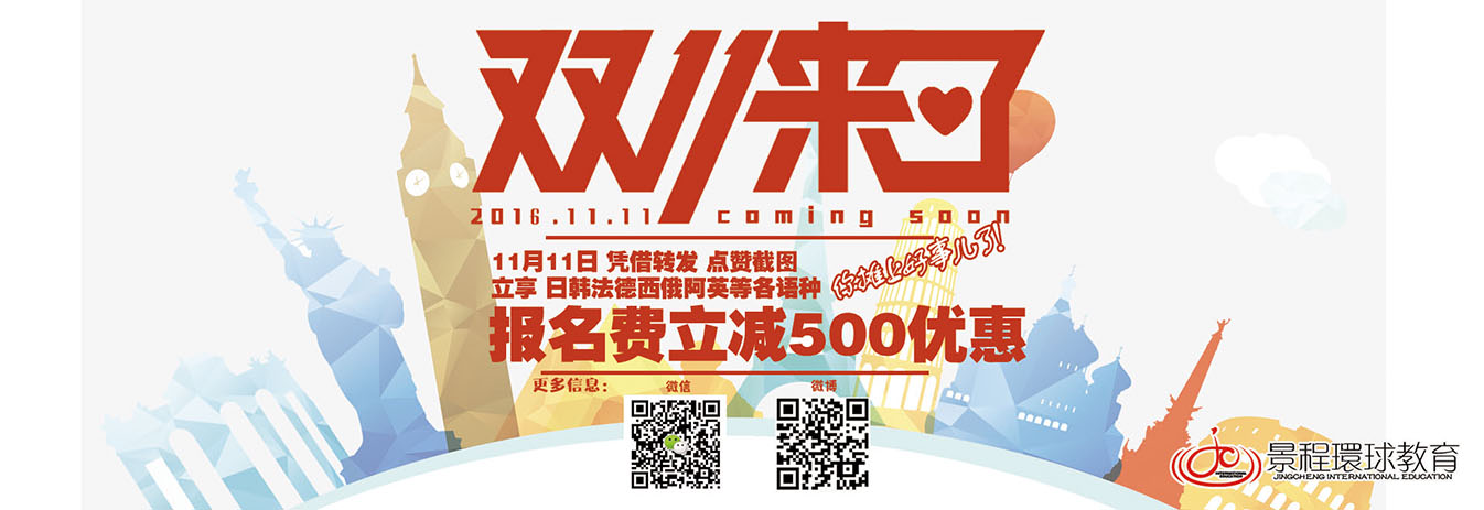 为了迎接双十一的到来并答谢七年来广大学子对于景程环球教育的厚爱,景程推出双十一报名优惠活动,活动期间,凡凭借微博、微信的转发、点赞截图报名的学员,均享受报名费立减500的优惠。