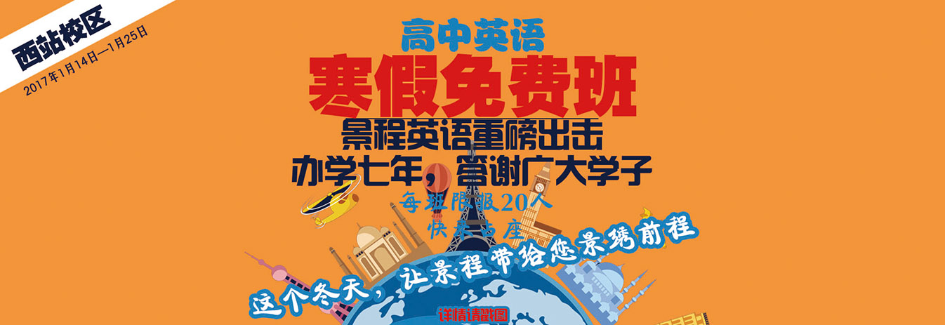 为答谢七年来广大学子对于景程环球教育的厚爱,景程英语西站校区推出寒假免费班活动,西站校区将开设三个免费班,每班限报20人,大家快来抢座把!